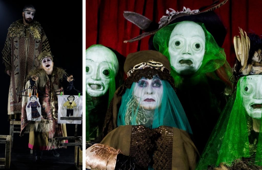 Com a cenografia de J. C. Serroni, a montagem cria um espaço duplo inspirado no circo-teatro mambembe e no palácio de Creonte. Os figurinos de Gabriel Villela são também um forte elemento cênico nesta montagem. Ao todo, são 27 peças usadas ao longo do espetáculo. Cada figurino traz a sobreposição de peças ou tecidos com elementos extraídos da natureza da floresta do cerrado mineiro.